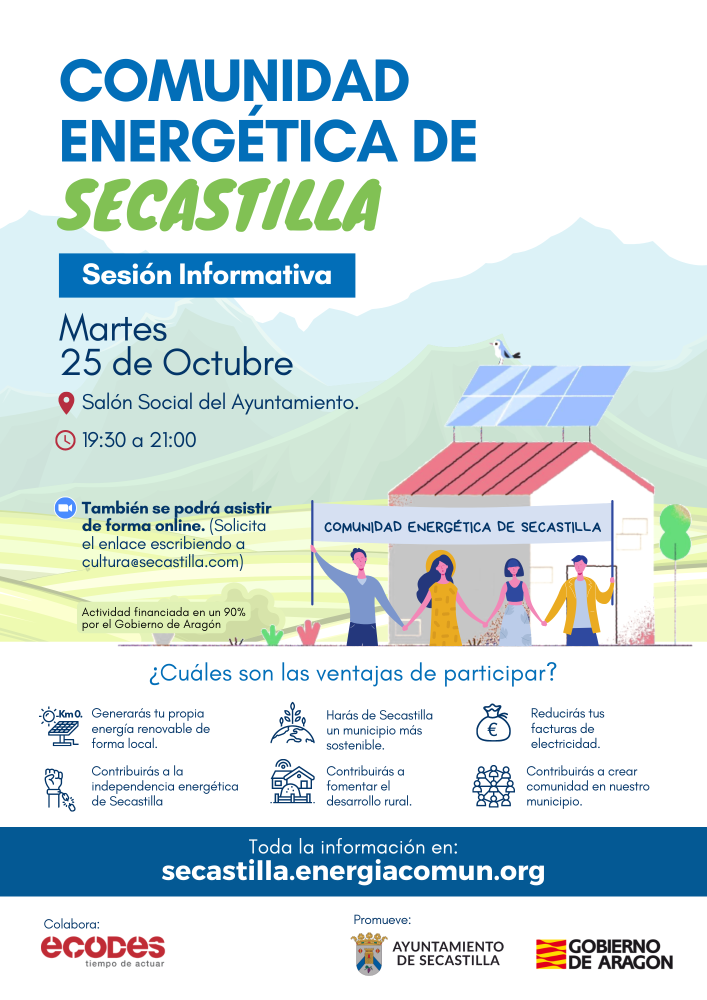 Sensibilizar a la ciudadanía sobre la problemática del Cambio Climático, y empoderarla para que asuma un papel activo en el nuevo modelo energético es fundamental. Por ello, desde el Ayuntamiento de Secastilla queremos favorecer este proceso desarrollando diferentes acciones dirigidas a acelerar esta implicación social a través de la creación de comunidades energéticas.